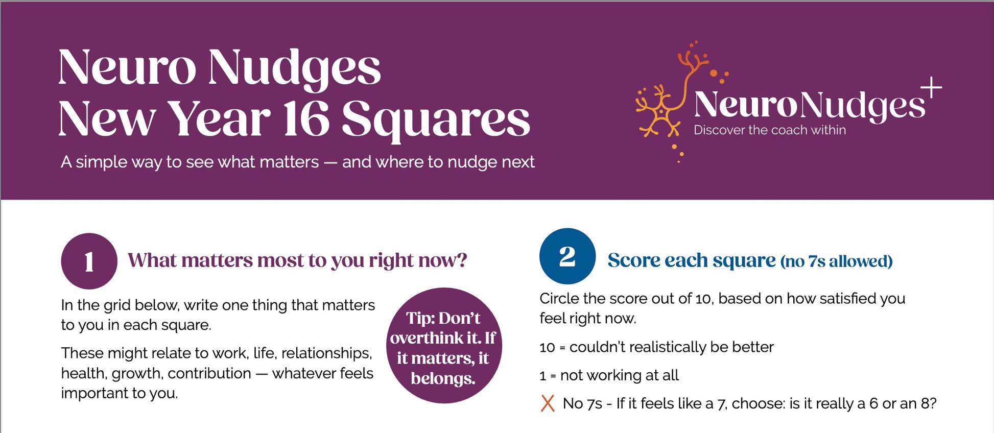The New Year 16 Squares gives you a simple, structured way to step back, see what actually matters in your life and work, and decide where a small nudge would make the biggest difference.
